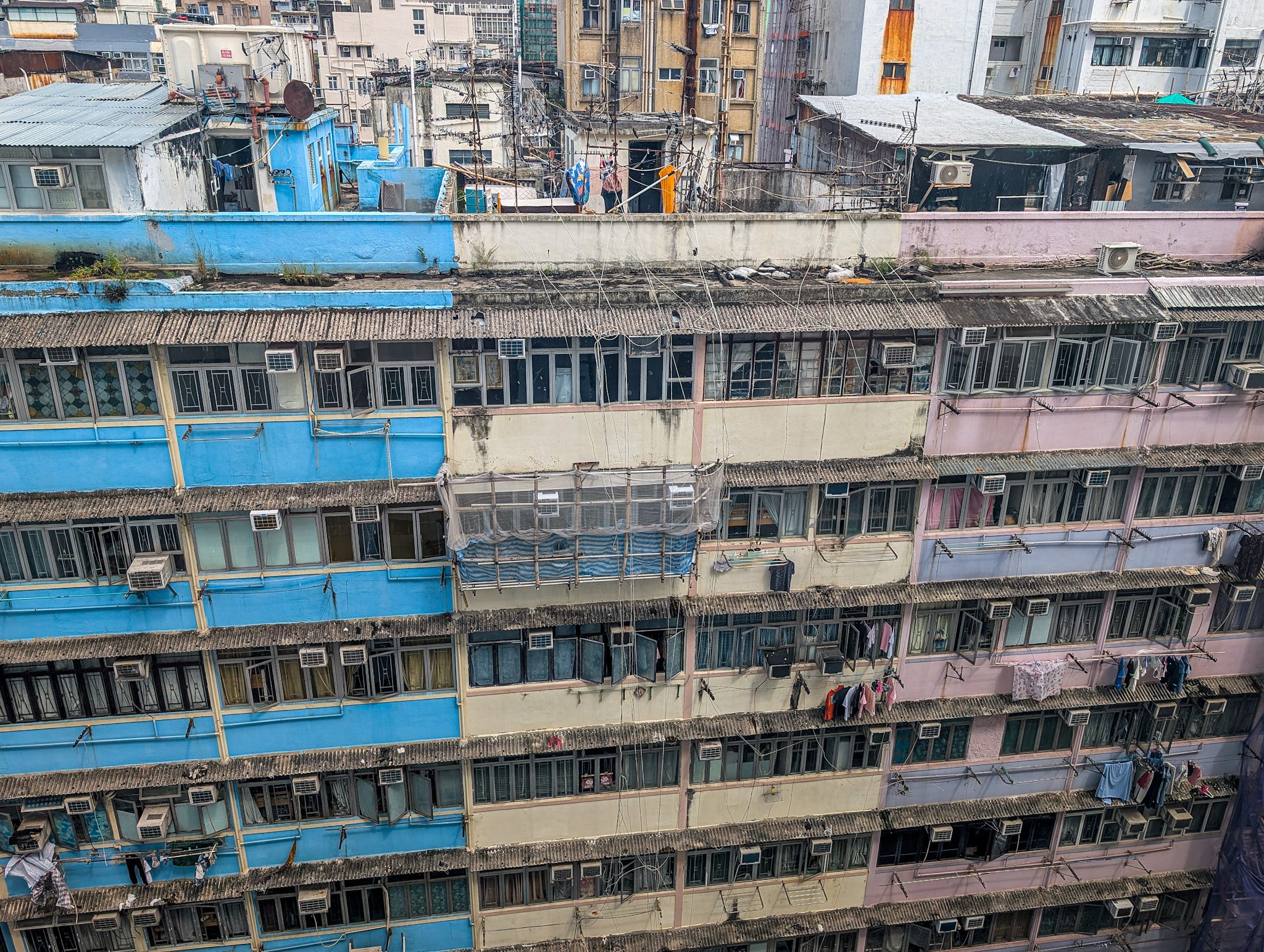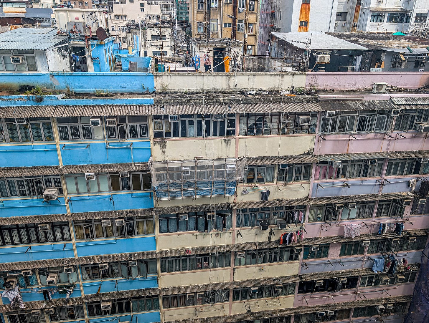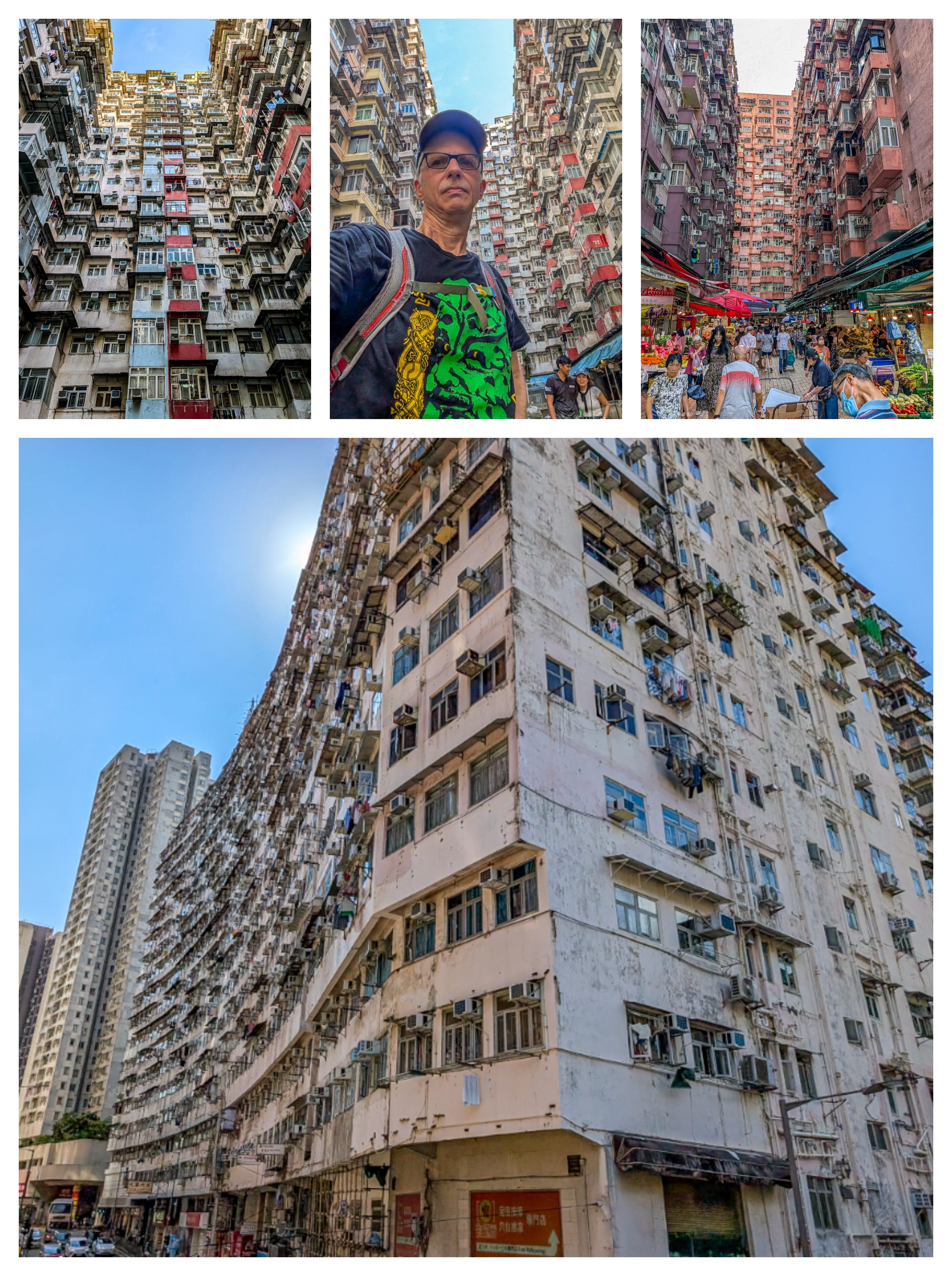 One afternoon, I took the metro to the Yick Cheong Building complex — widely known as the Monster Building. Five interconnected 17‑story towers housing between 7,000 and 10,000 people, each apartment roughly 350 to 450 square feet, typically home to a family of three or four.