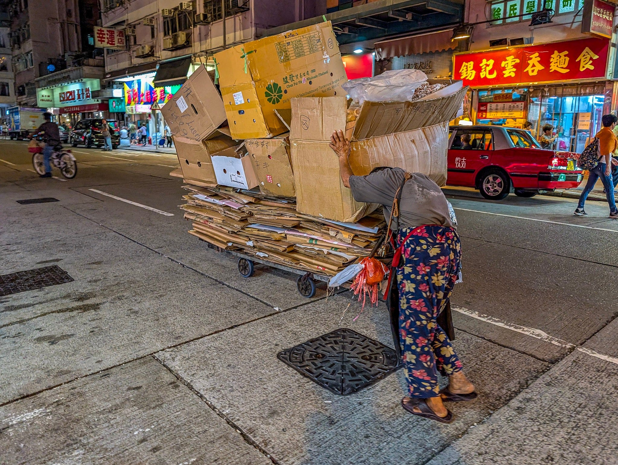 She is a “cardboard granny” — one of hundreds of elderly Hong Kongers who push carts through the city collecting discarded cardboard to sell for a few dollars, supplementing incomes so meager that this grueling labor is worth doing in the sweltering heat.
