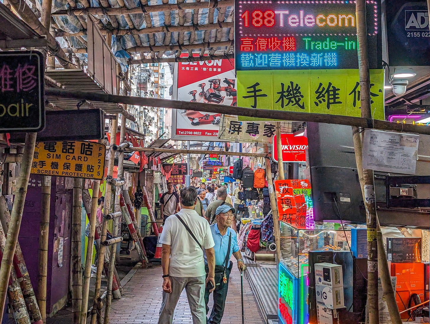 Two of my walks in Hong Kong took me to Sham Shui Po, one of the city’s poorest districts. I was drawn by the street markets — especially Apliu Street’s flea market, photogenic in that gritty urban way that street photographers love.