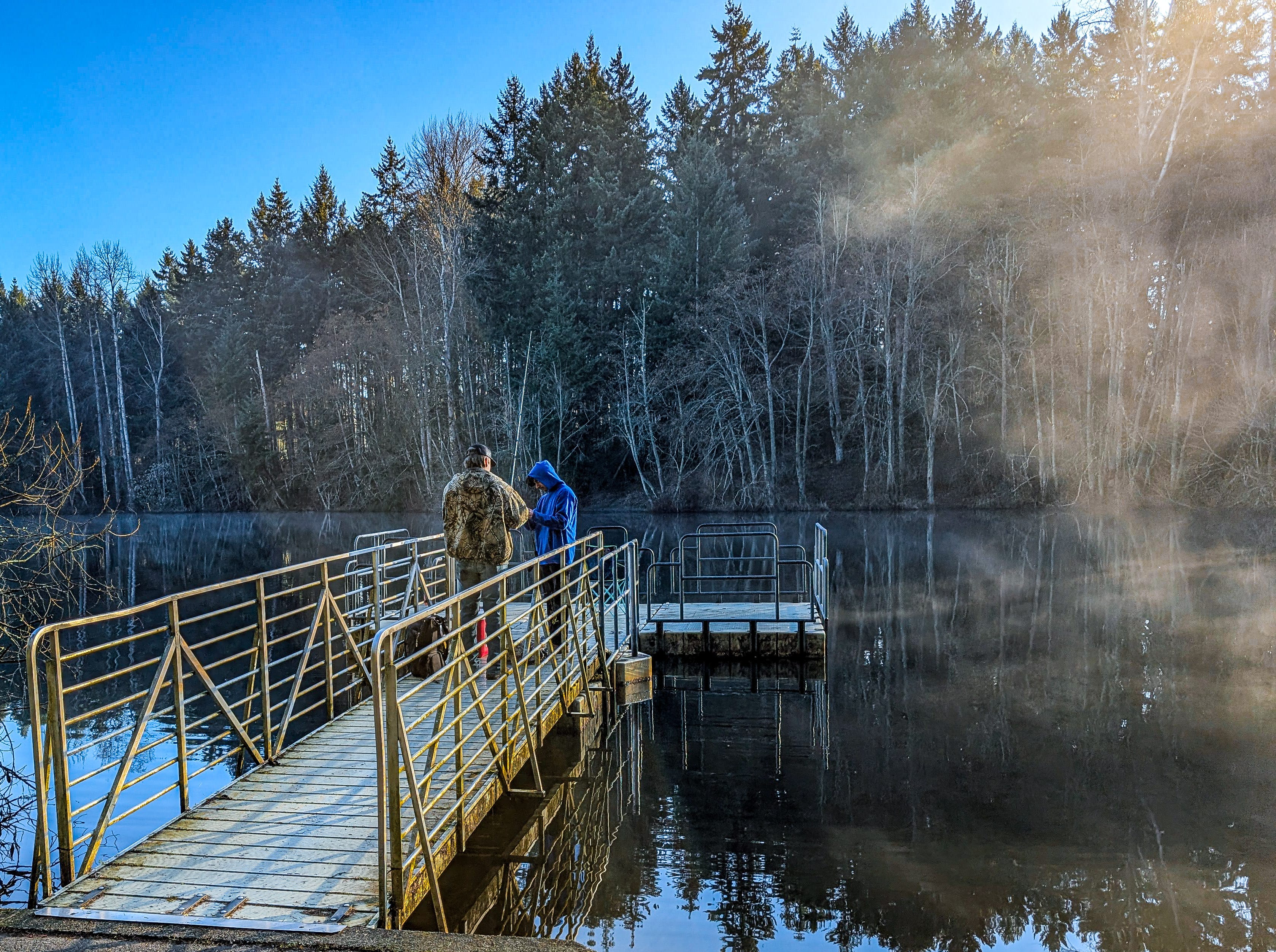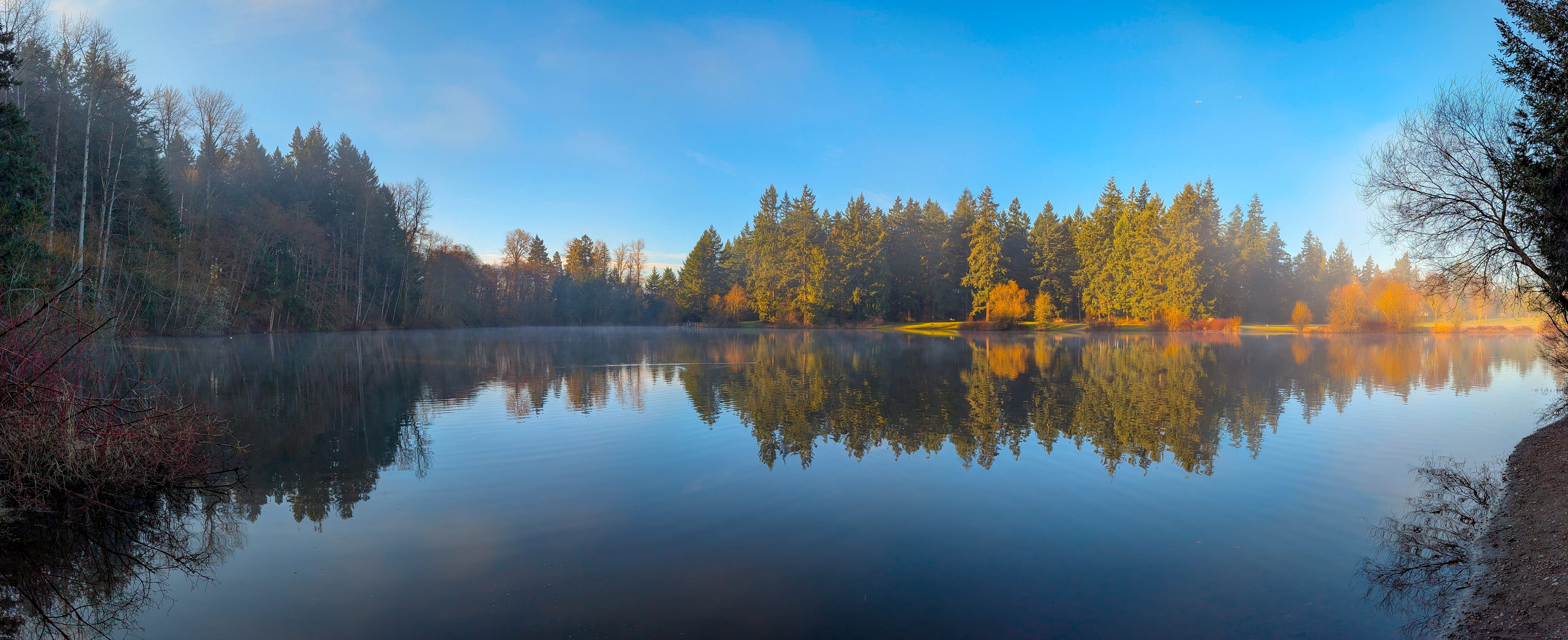 I left at 7:45, and the drive went right past the park. So when I glanced over and saw the sun breaking through the clouds and a lovely mist burning off the lake, I immediately did a U-turn.